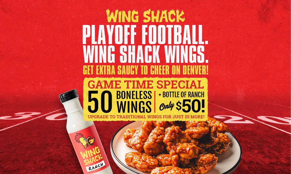 Get Game Day ready with Wing Shack. 50 Wings. Bottle of Sauce. Available Saturday and Sunday ONLY through the Super Bowl.